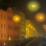 Maalaukset öisestä Helsingistä leikittelevät pimeyden ja värikkäiden valojen vaihtelulla. Tuttu kaupunki näyttäytyy utuisena ja mystisenä ympäristön hiljentyessä iltaan ja yöhön. Maalaussarja näytteillä Cafe bar 9:ssä 9.2-6.3.2014